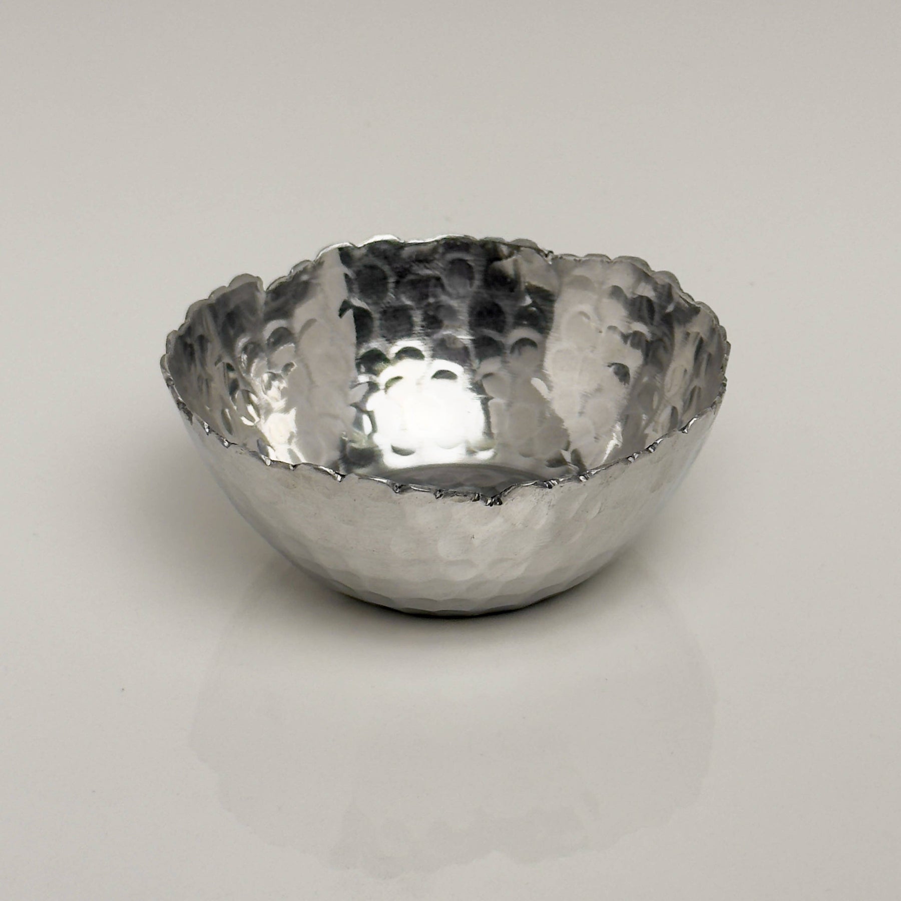 The Small Hammered Aluminum Bowl with Torn Edges is a stunning addition to any home decor. Crafted with precision and attention to detail, this bowl is perfect for serving a variety of dishes. Made from high-quality aluminum, it boasts a sleek silver finish that adds a touch of elegance to any table setting. The hammered texture gives it a unique and rustic look, while the torn edges add a modern twist. Whether you're hosting a dinner party or simply enjoying a meal with your family, this bowl is sure to impress your guests. It is also versatile enough to be used as a decorative piece, adding a stylish touch to any room. Upgrade your serverware collection with this exquisite aluminum bowl and elevate your dining experience.