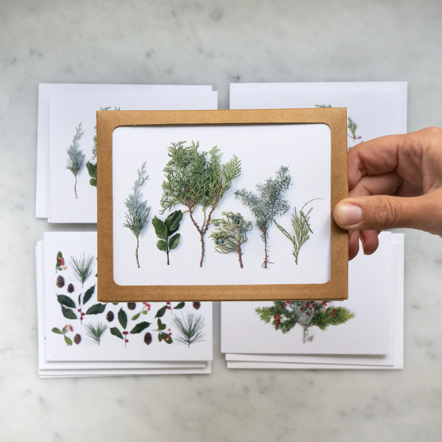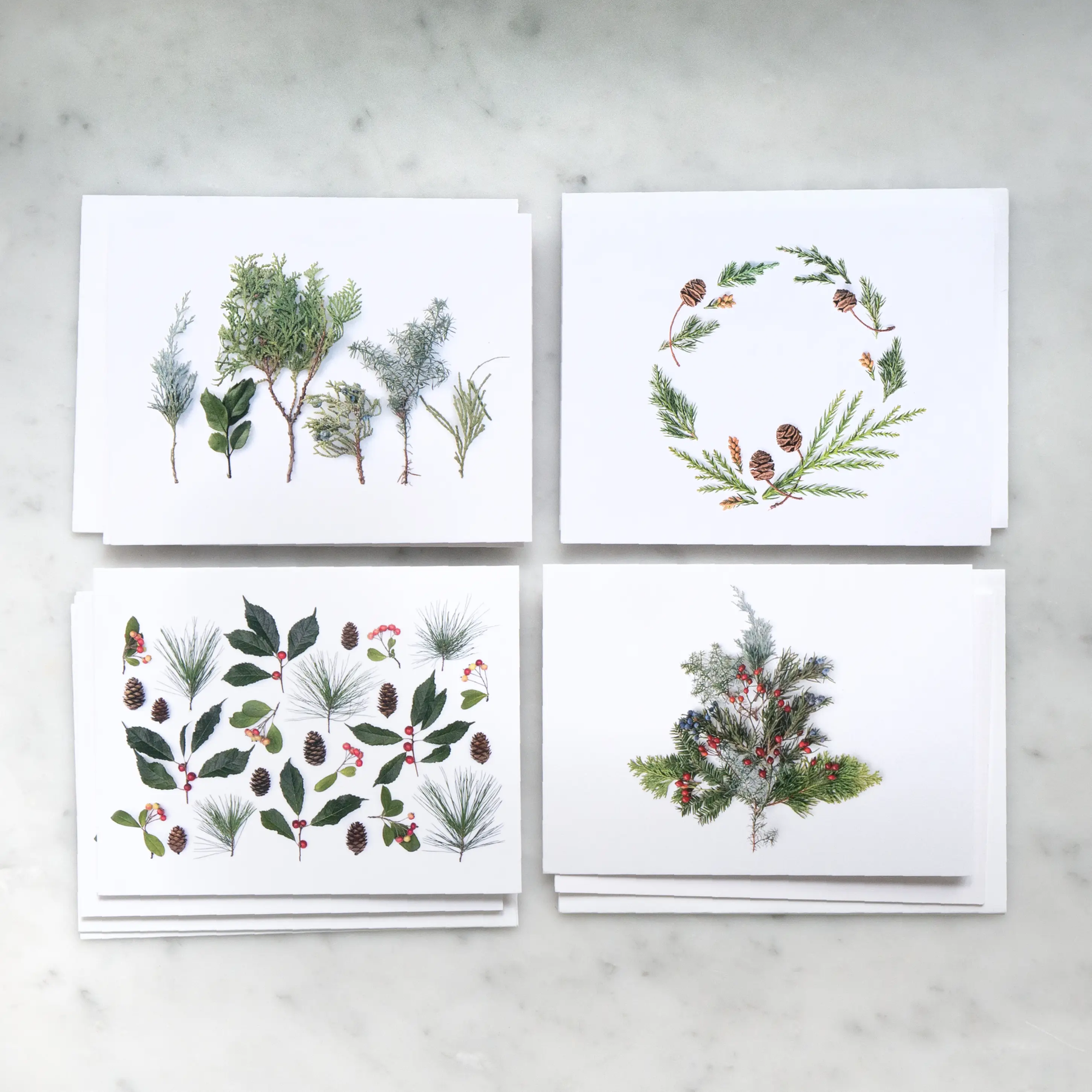 Set of eight (8) luxurious folding cards featuring images of holiday evergreens in pretty patterns - a wreath, a tree and more. Created using real plant material and contemporary photography techniques. Two cards each of four designs. Matching envelopes included. Packaged susatainably in a kraft paper box with a sticker on the rear showing a preview of cards contained inside and pertinent information about the cards - 130# , FSC certified card stock.