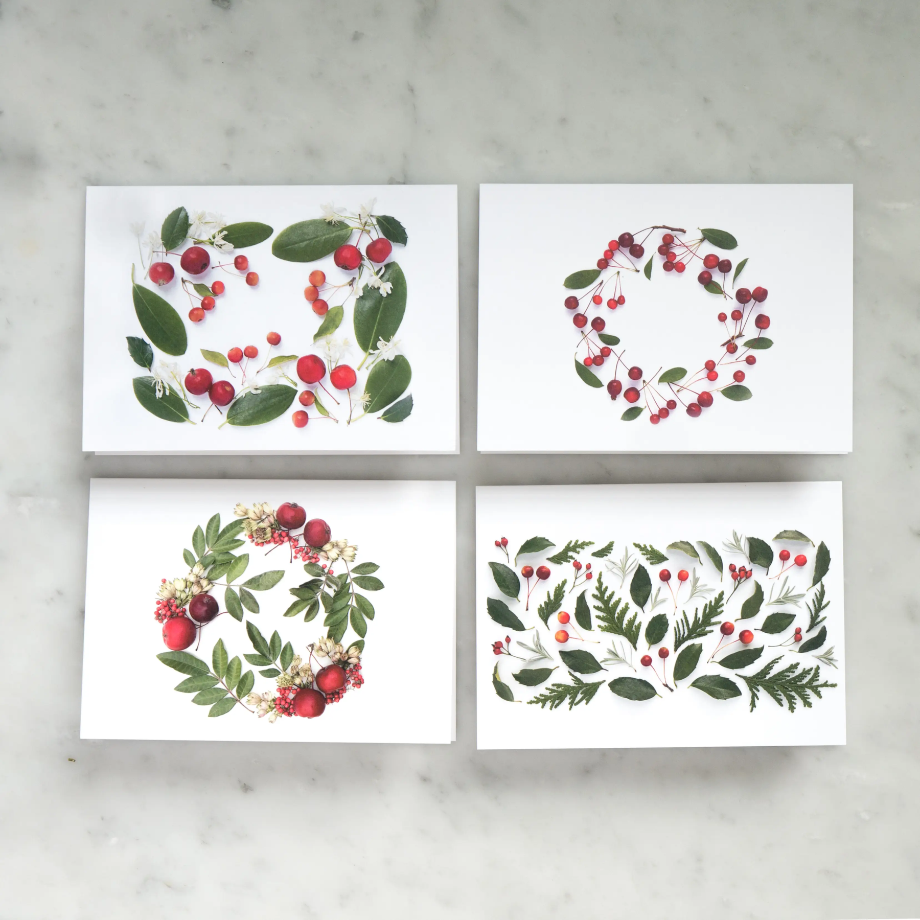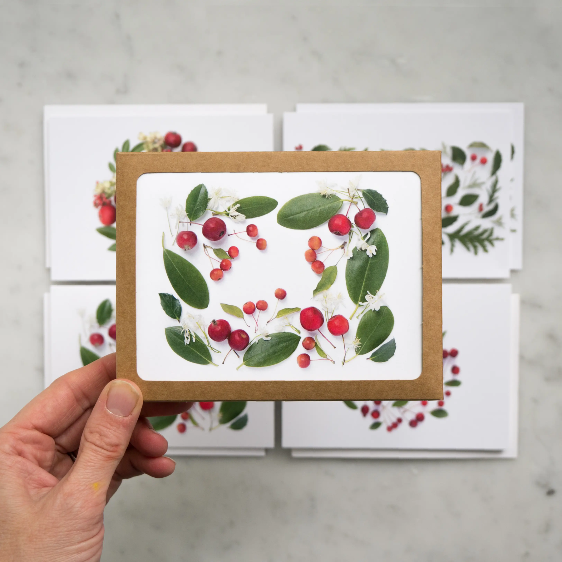 Set of eight (8) luxurious folding cards featuring assemblages of evergreen leaves and red berries, crabapples, holly, and more. Created using homegrown and wild plants and contemporary photography techniques. Two cards each of four designs. Matching envelopes included. Packaged susatainably in a kraft paper box with a sticker on the rear showing a preview of cards contained inside and pertinent information about the cards - 130# , FSC certified card stock.