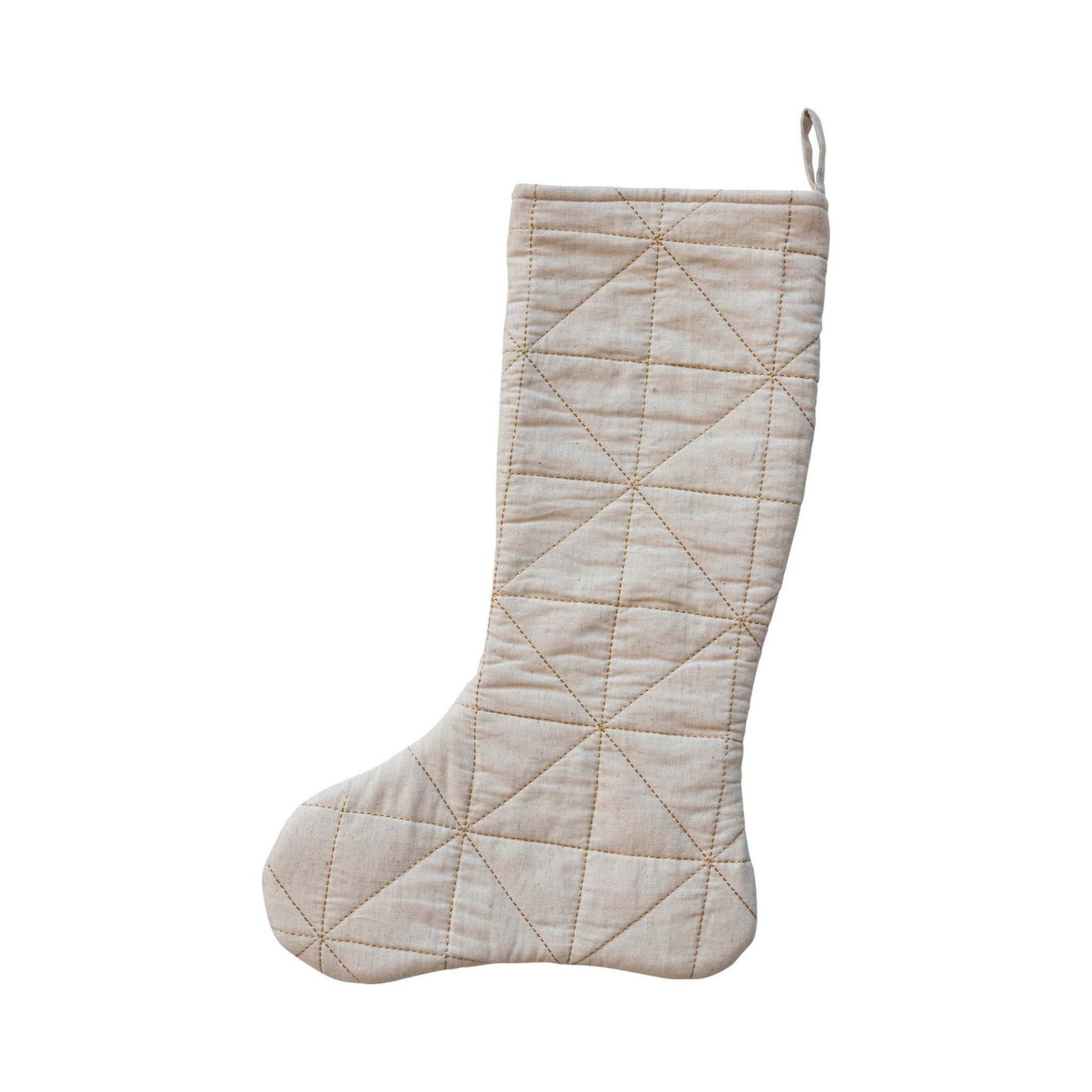 This beautiful natural cotton and linen stocking features a kiss of gold embroidery.